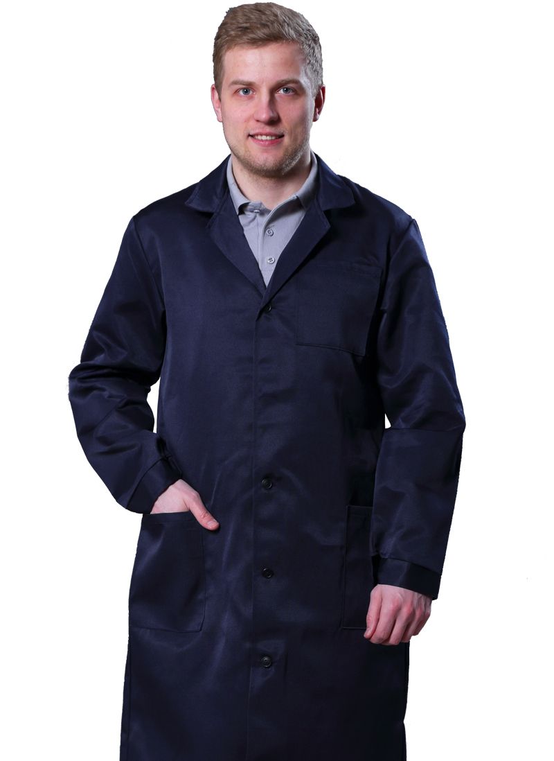 Халат с центральной бортовой застежкой на петли и пуговицы. Воротник отложной. Полочки с одним нагрудным и двумя нижними накладными карманами. Нижние карманы входят в боковые швы. Спинка со средним швом, с хлястиком, втаченым в боковые швы. Рукава с манжетами, застегивающимися на пуговицы.